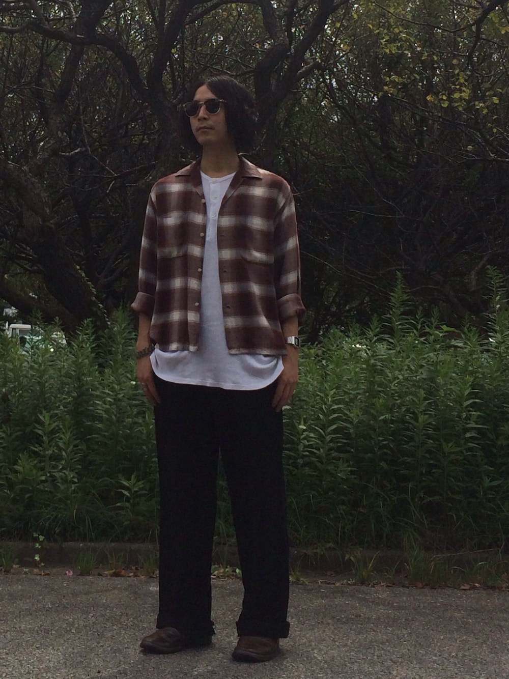 この前、携帯充電器が故障したので新しく購入したんですが、 購入後に某ドーナツ屋さんで一休みし、 家に帰ろうと駅に向かっている時に...あれ...何かが無い... やっべ、充電器を忘れてきた!と、急いでお店に戻り忘れ物が無かったか尋ねてみたところ... なんとお店には無く、買って数時間も経たず内にどこかに消えてしまいました。 なかなかショックな出来事でした。 はい、今日はシンプルコーデ。 50〜60年代物で固めてます! 今年の秋のチェックはオンブレ推しです! 特にオープンカラー、ボックスタイプは1枚でサラッと羽織ってもかっこよし。 ユーロウールスラックスの太パンを合わせて、足元はジャスティンのウエスタンブーツで遊び心を...。 後ろの木の枝と髪の毛がまさかのマッチで、どこが髪でどこが枝なのかわからなくなってます。 これが本当の枝毛ということなんでしょうか。