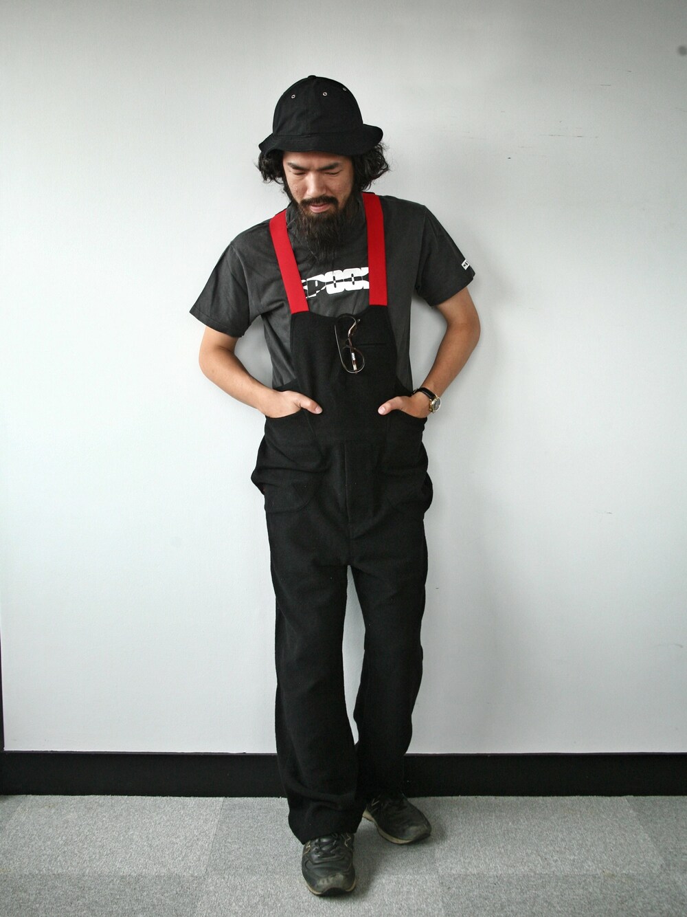 オーバーオールを着るとなんか何かの職人になった気分。全身黒なのでサスペンダーの赤が際立ちます。