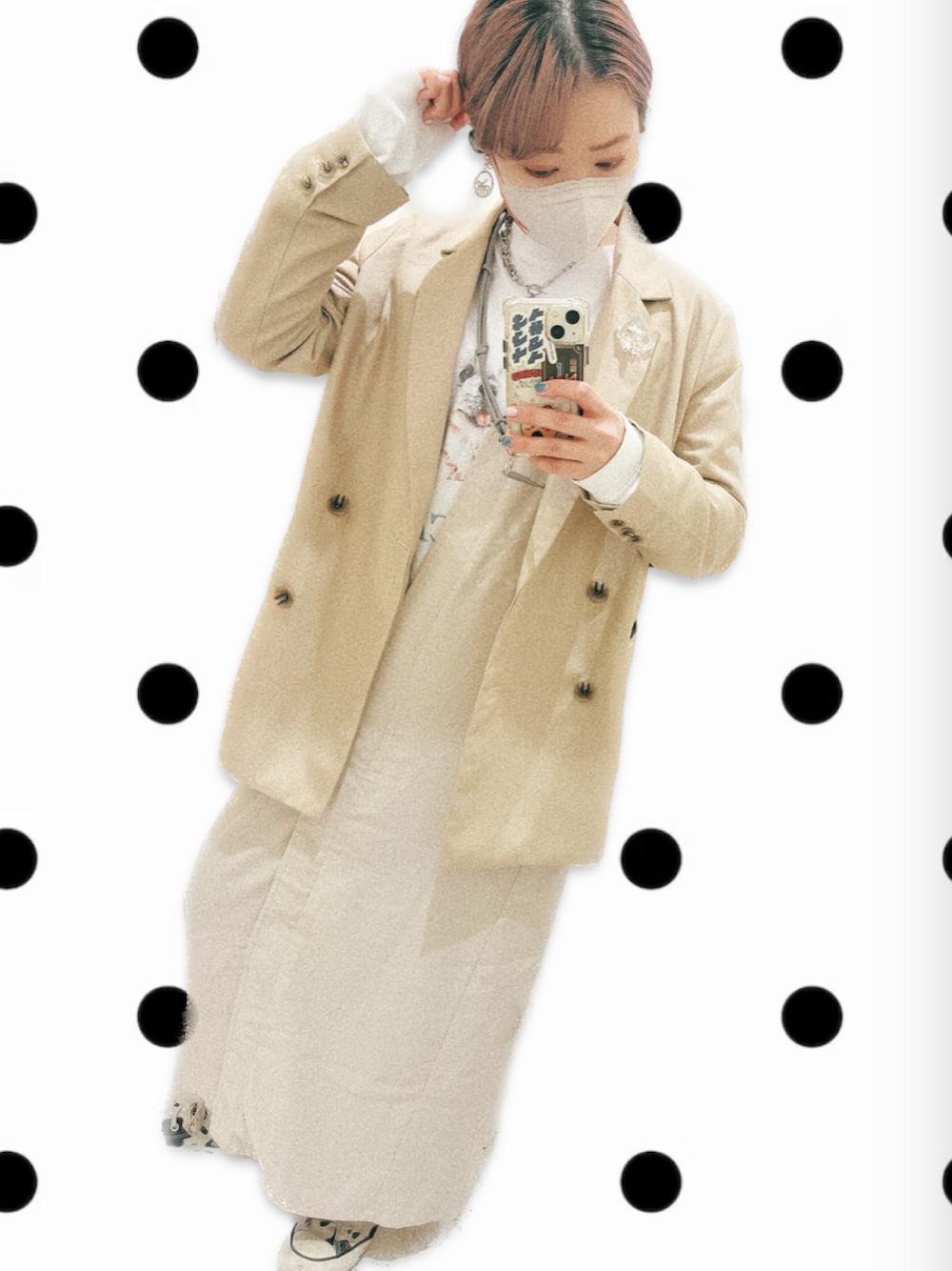 なにか悩んでますね ジャケットスタイルを最近とり入れたので 合ってるか不安なんでしょうね ワントーンで揃えるとなんでもいけると どこかで習ったので教えに添いましたが どうでしょうか… 私は大好きです、これ ジャケットもワンピもKBF この間ついに関西店舗に言ってみました。 河原町OPA店めちゃ開けてて 窓から光も入ってとても綺麗でした。 あとこのとき付けてるイヤリングは 二丁目でオールした時に失くしました。 つらいです。
