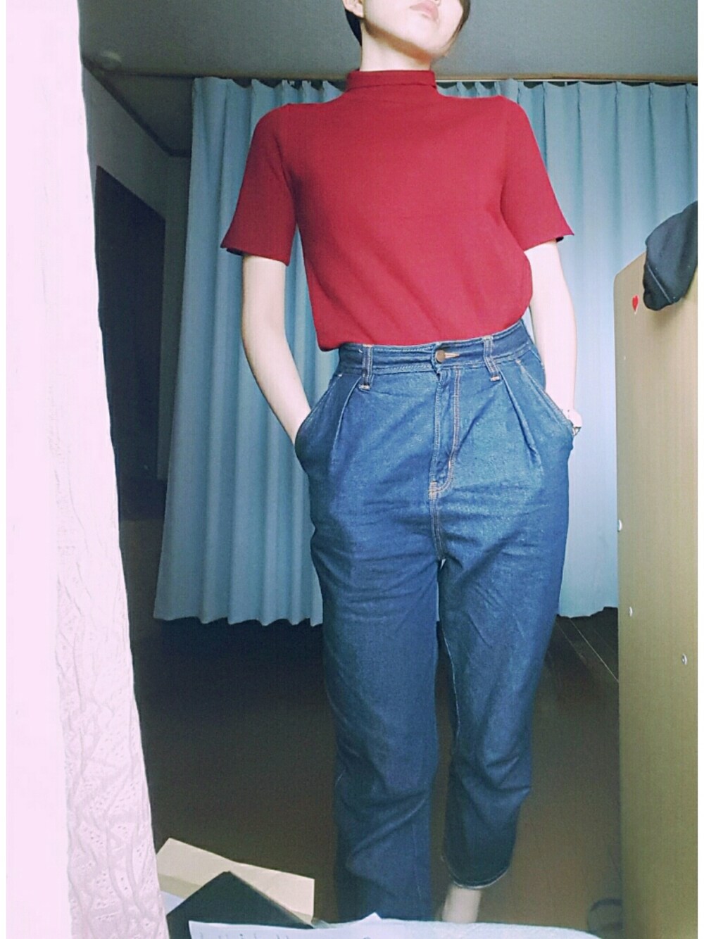半袖タートルニットは1枚で着た時の形が可愛いのに、単体で着れる時期が限られているという儚さがあります 部屋汚い。