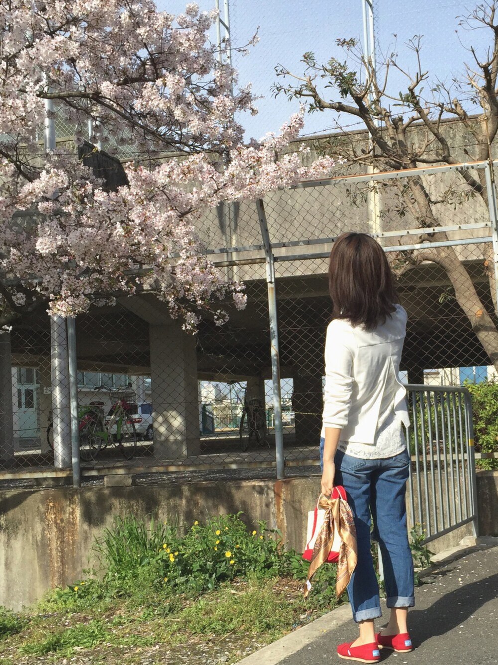 ご覧いただきありがとうございます❤️ いつもの撮影場所も桜満開です🌸 写ってないけど、この先はずーっと桜の細道✨ そこを通り抜けるたびウキウキします😊 トップスは後ろ姿が可愛いレース✨ こういうデザイン性のあるアイテムの時は、他はシンプルに…。 TOMS今年も出しました🙋 私にしちゃあ珍しい色モノ。 どシンプルコーデ+差し色 白、デニム、赤 大好きです❤️ ではではん😙