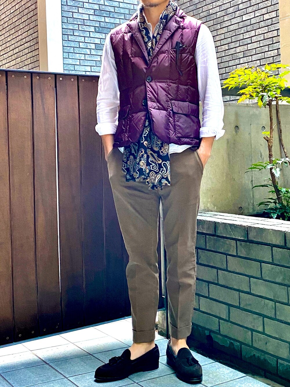 ダウンベストにシャツを合わせたシンプルコーデ。 胸ポケに眼鏡をさしてアクセントに👓 アラフォーオジサンの春スタイルでした😎