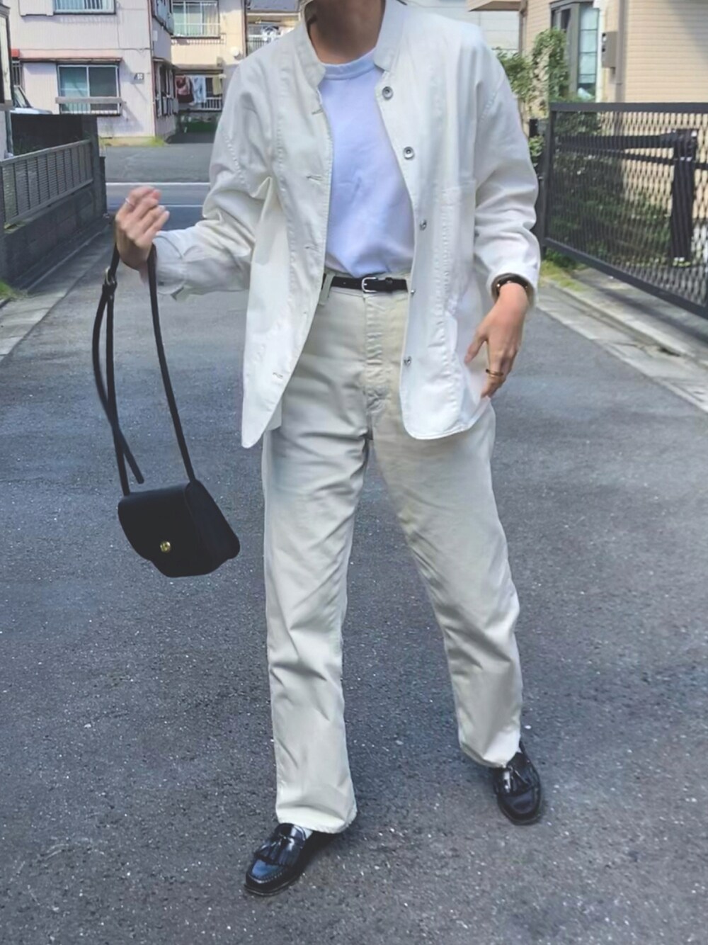 今日はオールホワイトにしました⚪️ +黒縁メガネをしています👓 黒の小物でなるべく締めるように意識しました。 Uのデニムジャケットは以前購入したものですが、形が変わっていて可愛い。気に入っています〜◎