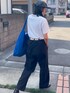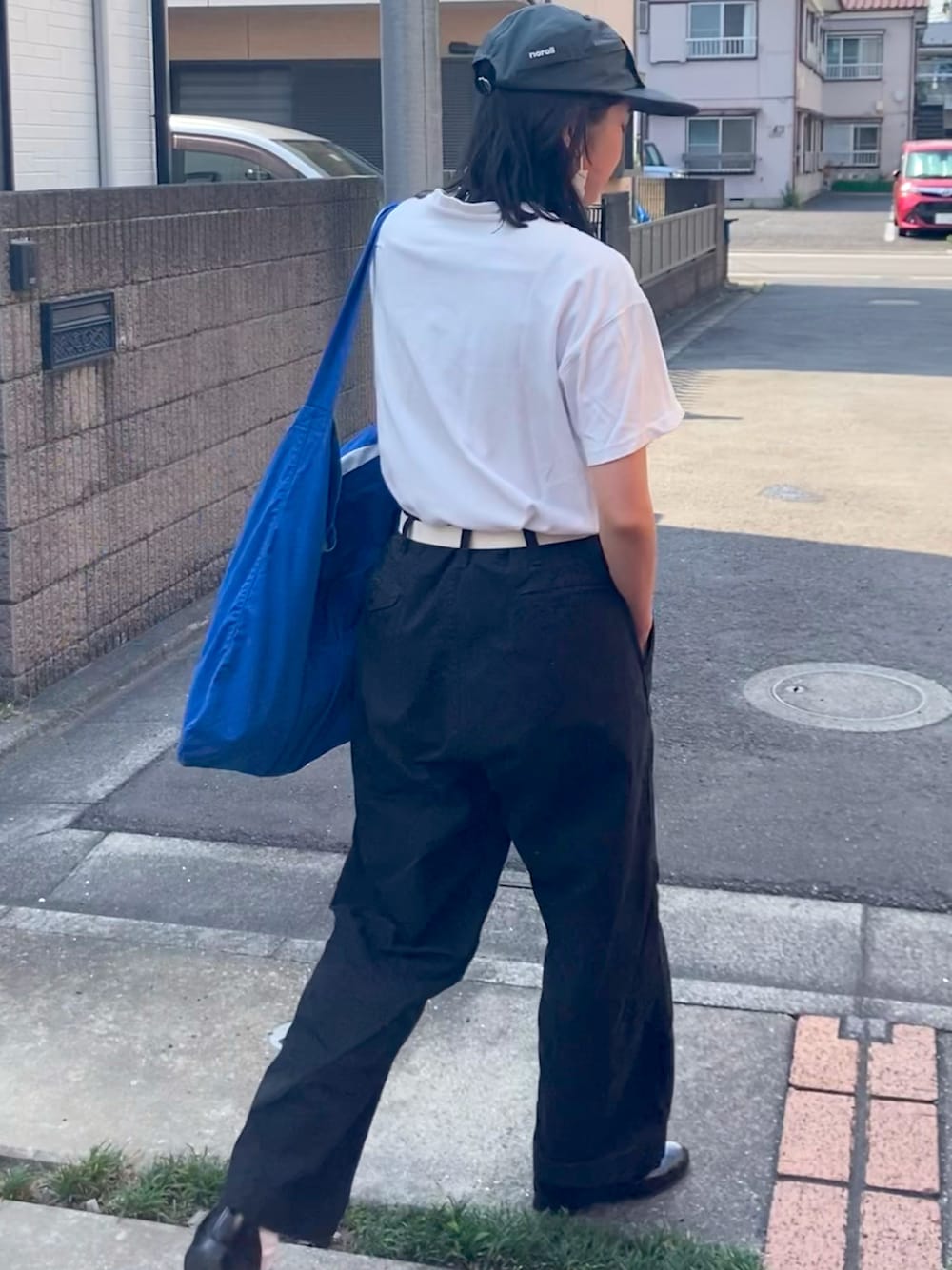 暑すぎます🔥 無地の白Tだったので、トートバッグを青色に🔵 足元は最近サンダルばかりだったので、今日はローファーにしてみました。