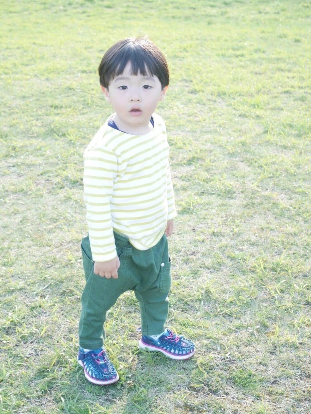 2017.5 GW中のコーデ。 里帰り先の実家→自宅への移動で荷造りしてしまったので、上下3、4着で1週間くらい着回ししてました。 その中でも1軍選手だったこのトップスとパンツ。 petit mainのボーダー、去年はベージュを着ていましたが 今年は黄色にしました。春らしくて可愛いかったです♡ 最近暑くなってきたので、もう着られないと思うと淋しいです。。。秋と来年の春も着られると嬉しいな♡ パンツは去年の春から愛用中。 去年は折らなくちゃ履けなかったので登場回数少な目でしたが、この春はそのまま履けるようになったのでよく履いています。 お腹ポッコリが邪魔して、ウエスト部分のひらひらが上手く出ないのがとても残念。。。 首元からUNIQLOの下着が見えちゃってるのも残念。。。😂 KEENは靴下ありで履いても素足で履いても履きやすいのか、自分でこればかり選んで履いています。 nato父と色違い。母は持っていないので、うらやましいな〜です😂 トップス:100 パンツ:90 シューズ:16.0 見ていただきありがとうございました♡☺︎