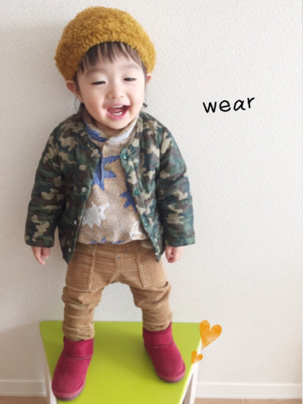 先週の日曜の高熱が嘘だったみたいに、すっかり元気なnatosanー☆ お母ちゃんもすっかり元気になりました♡ 午前中いっぱい遊んだ後、 午後からはお父ちゃんの用事の付き添いに... でも目的は... 用事先のそばのpetit mainのお店♡ wearでみなさんが可愛く着こなしされていて、発売当初から気になっていたデニムサロペット♥ サロペ好きのお母ちゃん的にもどんぴしゃな形✨ でも、試着しないことにはわからないし...の間に、ネットではsold out... お店にもなかなか行けないので、あきらめていたのですが、今日急きょ見に行けることに♡♡ 胸おどらせながら店内へ... あったー‼︎♡ しかも女の子ゾーンに!(そうですよね💧) 手に取ると、80、100、 聞いてみたら90はsold outと... 80大丈夫かなぁ...と、いざ試着✨ ん?おなかのへんもりっとしてる⁇ 1度はお返ししました。。。 でも、やっぱり気になる‼︎ 薄手のトップスで再チャレンジ!(natosan、たびたびごめんよ💧) 「そんなに気にならないですよ♡ワンサイズ大きいとグッと大きくなりますよ!」の店員のお姉さんの言葉にそっかぁとなって、(いや、心は決まってました✨) お持ち帰りしてしまいました💖 新年からさっそく着せられるように、コーデを勉強しようと思います♡ しかも、きのうのタートルの色違いのキャメルも買ってしまいました💖 幸せ😍♥(お父ちゃんにはそんなに服いらんやんと言われましたが...💧) と、長々今日のお買い物経過を綴ってしまい、すみません(>_<) 今日のコーデのポイントは、 サイズアウト前に着せておきたいトップスと、 この季節に着せておきたいコーデュロイパンツと、モケニットの同色系コーデに、 赤とカモフラで少し変化をつけました。 今から帰省の荷造り、頑張ります!
