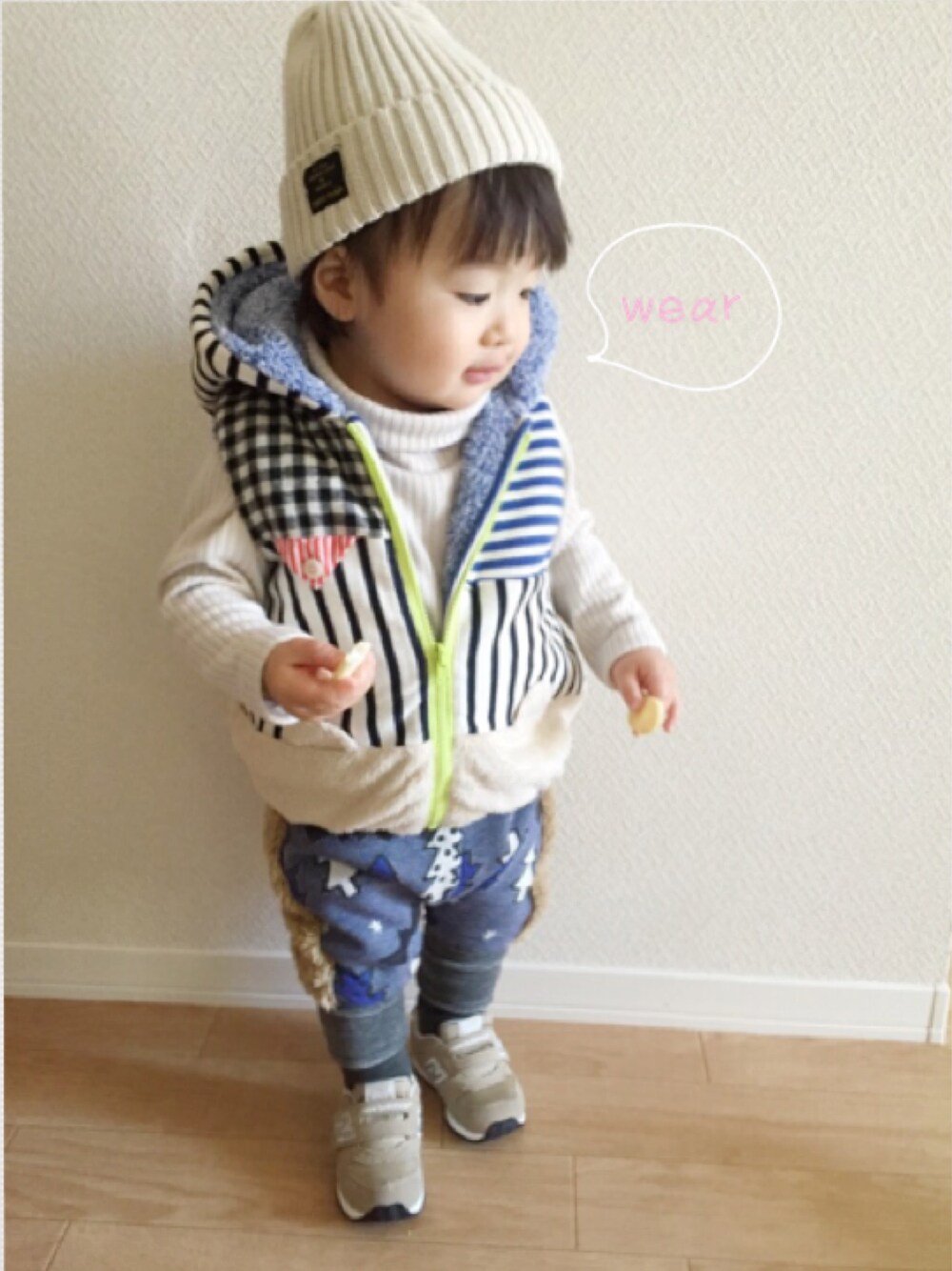 今日のコーデ☆ 昨冬先買いで買ってあったレイヤードスタイルのボトムス。衣替えした時サイズ80にしては大きく丈が長めだったので、この冬も無理かな〜としまい込んでありました。 今日ふと思い出してはかせてみたらなんとjustサイズ😱💦 もうみなさん春服にシフトされている中、まだ連日もふもふもこもこしちゃってます😂 ベストはいつものもふもふの方を内側にして着てみました。 あの後無事にお出かけできました。 出がけに前のお家のおばさんにお会いしたのでしばらく立ち話。 男の子3人を育てあげ、お孫さん7人、ひ孫ちゃんが2人いらっしゃるとのこと✨ イヤイヤ期の子供達と自分はこう接して良かったよ〜という子育てのアドバイスをいただきました✨ とても良いお話が聞けてnatosanはまだこれからですが、明るく前向きな気持ちになれました♡ natosanも初めは恥ずかしそうにしていましたが、そのうち走り回っておばさんに石ころのプレゼントを渡していました。 知らない土地に来ているので、気にかけていただけるのは本当にありがたいです😊♡ 私事のおしゃべり、失礼しました。 見ていただいてありがとうございます♡ いいね、save、フォロー、いつもありがとうございます♡♡