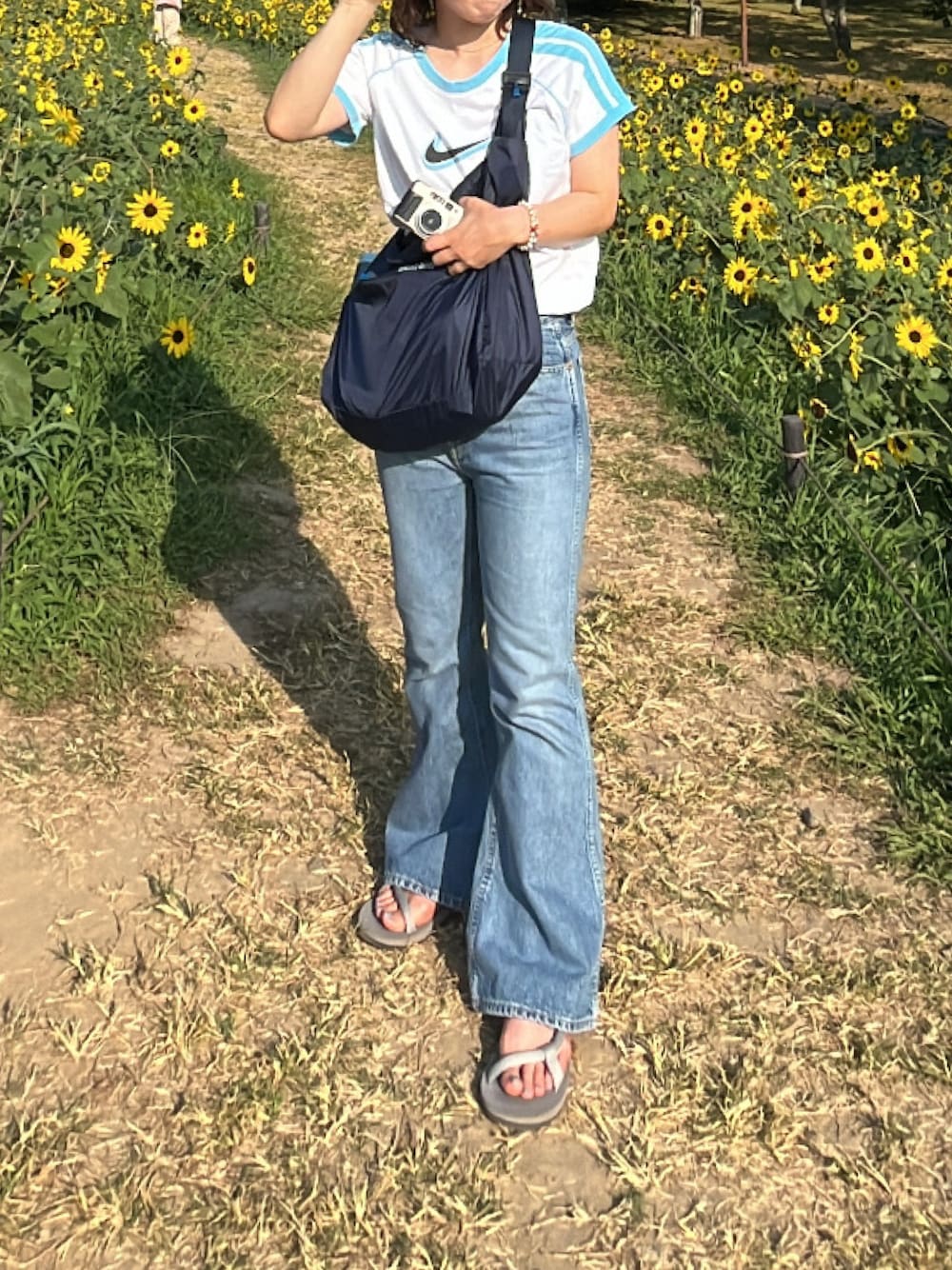 nacchiのデニムパンツ「HIGH WAIST BELL-BOTTOM DENIM PANTS (LIGHT INDIGO) ハイウエストベルボトムデニムパンツ (ライトインディゴ)[ショート丈]」を使ったコーディネート
