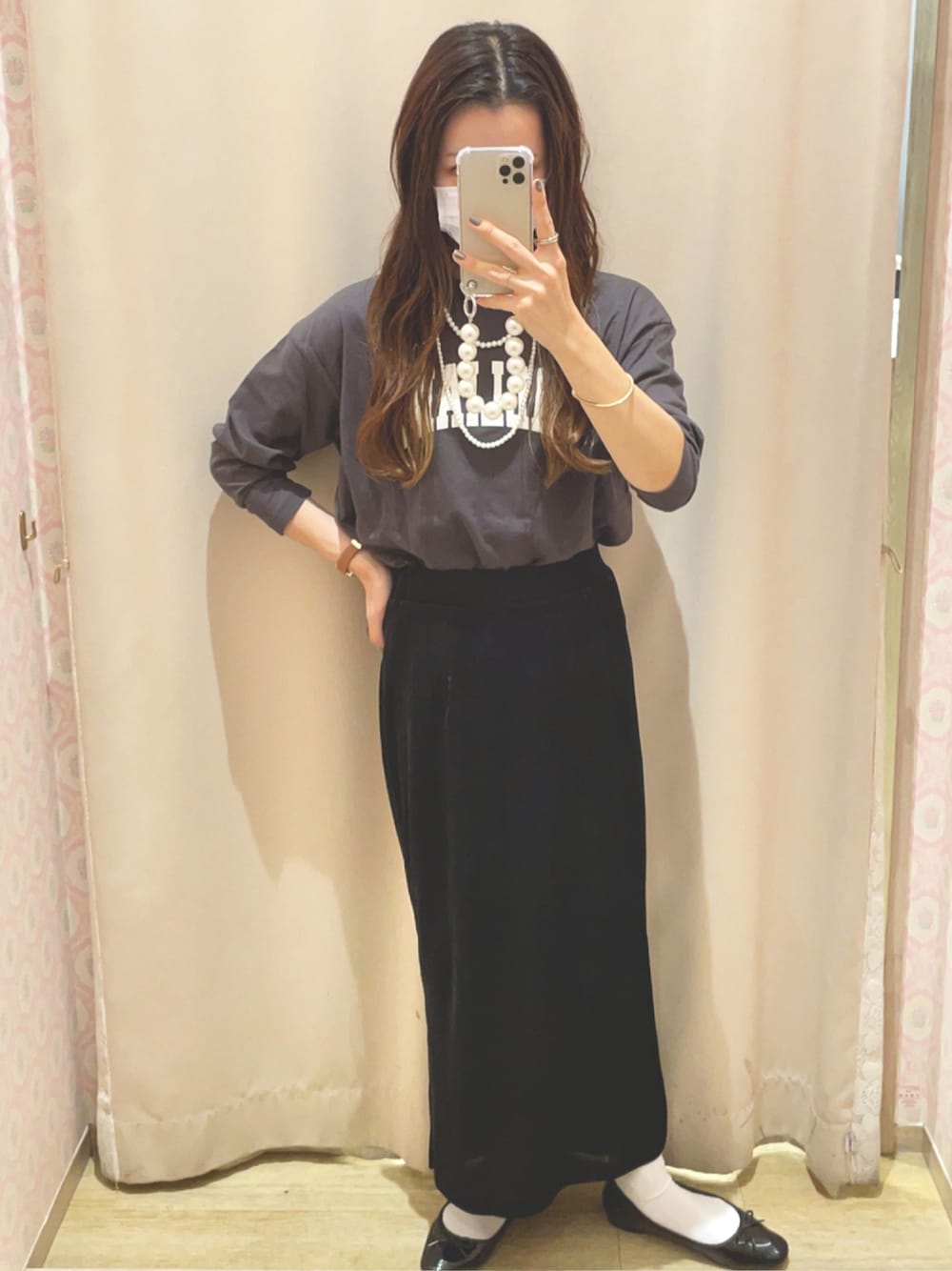 最近ブラックが多いです😂ベロアスカートの着回しです✊🏻チャコールグレーとの組み合わせ良き✨