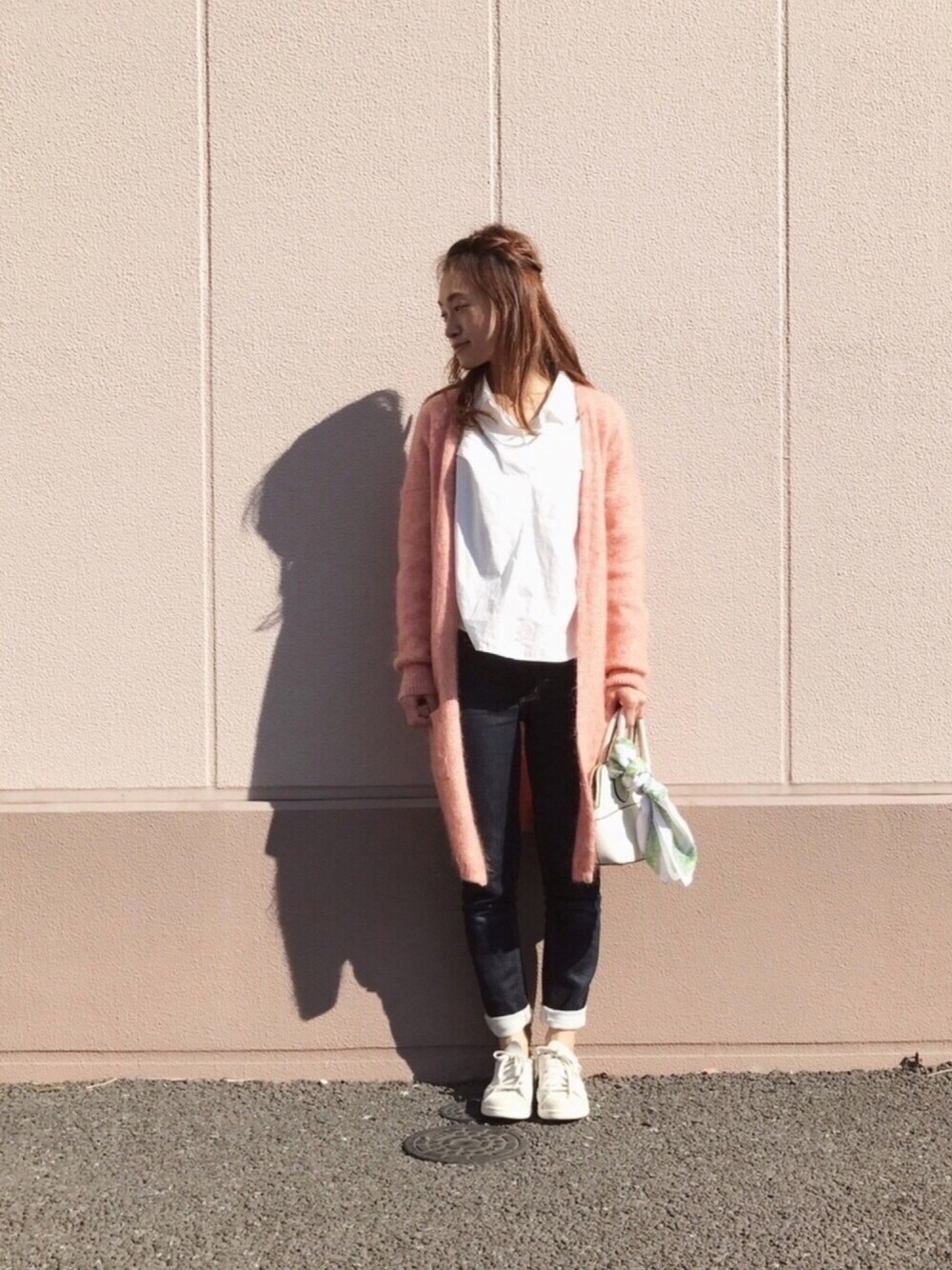 暖かいってステキ🌸 春コーデにしました♡ 白シャツにピンクのロングカーデで春っぽく(*^^*)