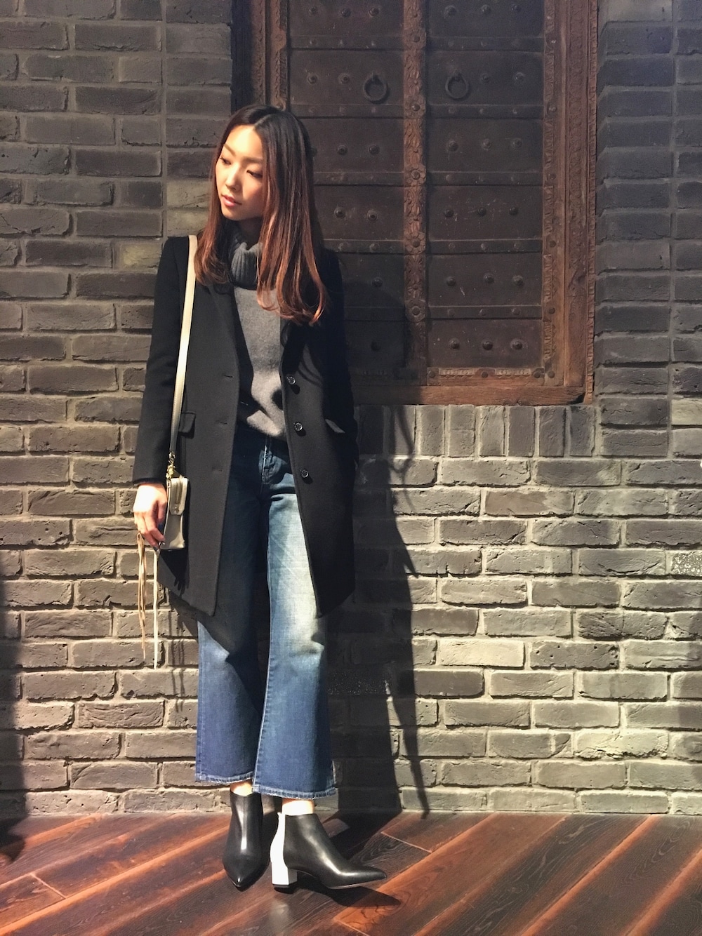 シンプルなチェスターコートにデニムを合わせてカジュアルダウン(*^^*) クロップド丈でセミフレアのワイドパンツで、今年っぽさも☆