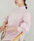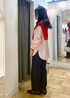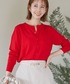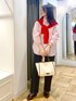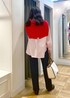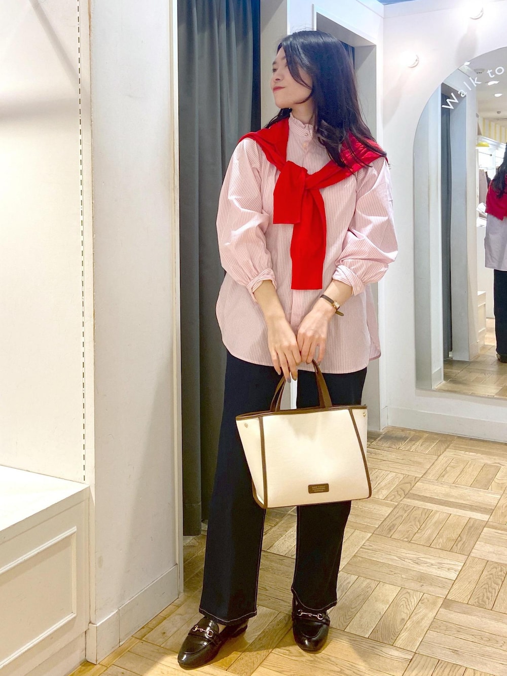 ピンクのストライプシャツが目立つようにコーディネートしてみました。 赤のカーディガンを肩かけしてアクセントに◎