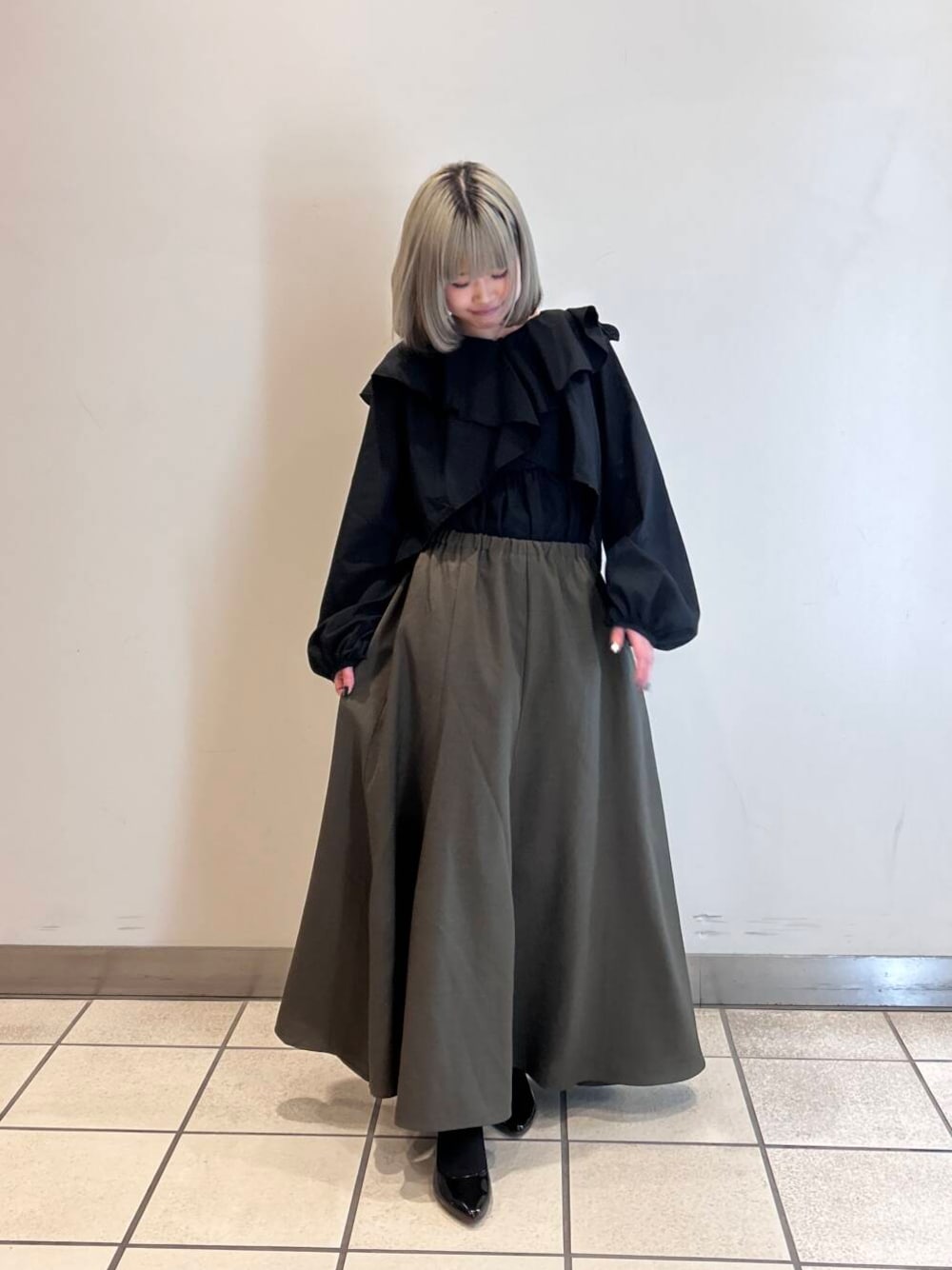 セットアイテム主役でコーデを組みました! キャミ×ボレロセットのアイテム!キャミだけできるのもおすすめです✨️✨️ 今回はボレロもセットで着ました! 長袖ですので今の気温にちょうどいいです!フリル感が控えめですが、ボリュームはしっかりでるので肩周りカバーしたい方にはピッタリです☺️ カーキのスカートに合わせてより上品でオシャレな雰囲気に仕上げました! ぜひアイテムチェックしてみて下さい🖤🖤🎶