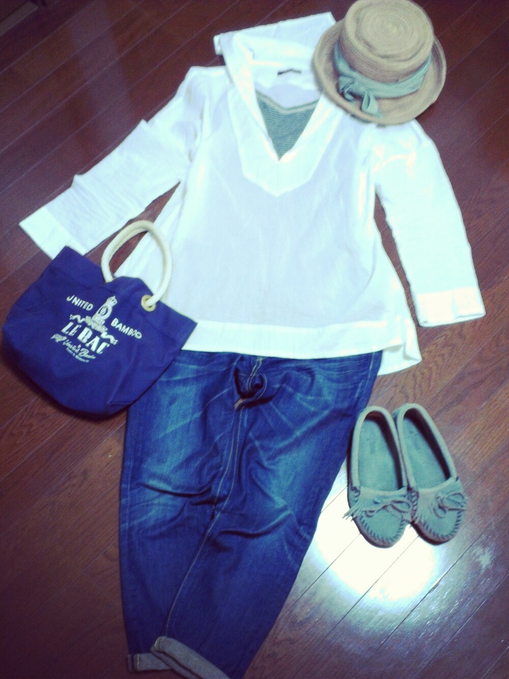 帽子/override☆ブラウス/pas de calais☆インナー/無印☆靴/ミネトンカ☆バッグ/united bamboo☆★☆★☆★☆★☆★セーラーブラウス可愛い♪早くミネトンカを素足で履きたい!帽子は夏素材なので気が早すぎますが、すごくお気に入りです。