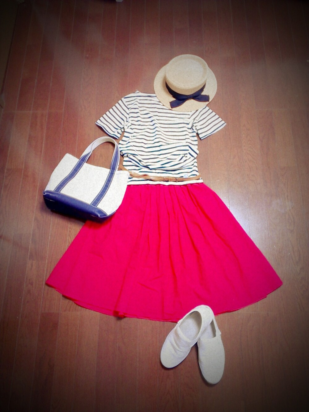 Hat:arth トップス:orcival スカート、靴:bulle de savon バッグ,:LLBean 細い麦ブレードは丈夫で高級感が出て、季節感も満載で個人的にイチオシです☆ 赤いスカートかなり使えます!