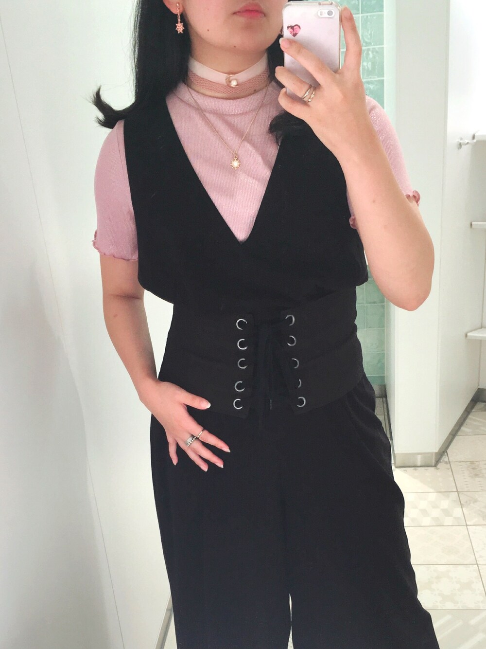 salopette →¥1,990- tops →¥790- belt → ¥190- earrings from Disney rings from Bikbok in Denmark chokers & necklace from levi’s in USA Another shot jacket →¥2,990-