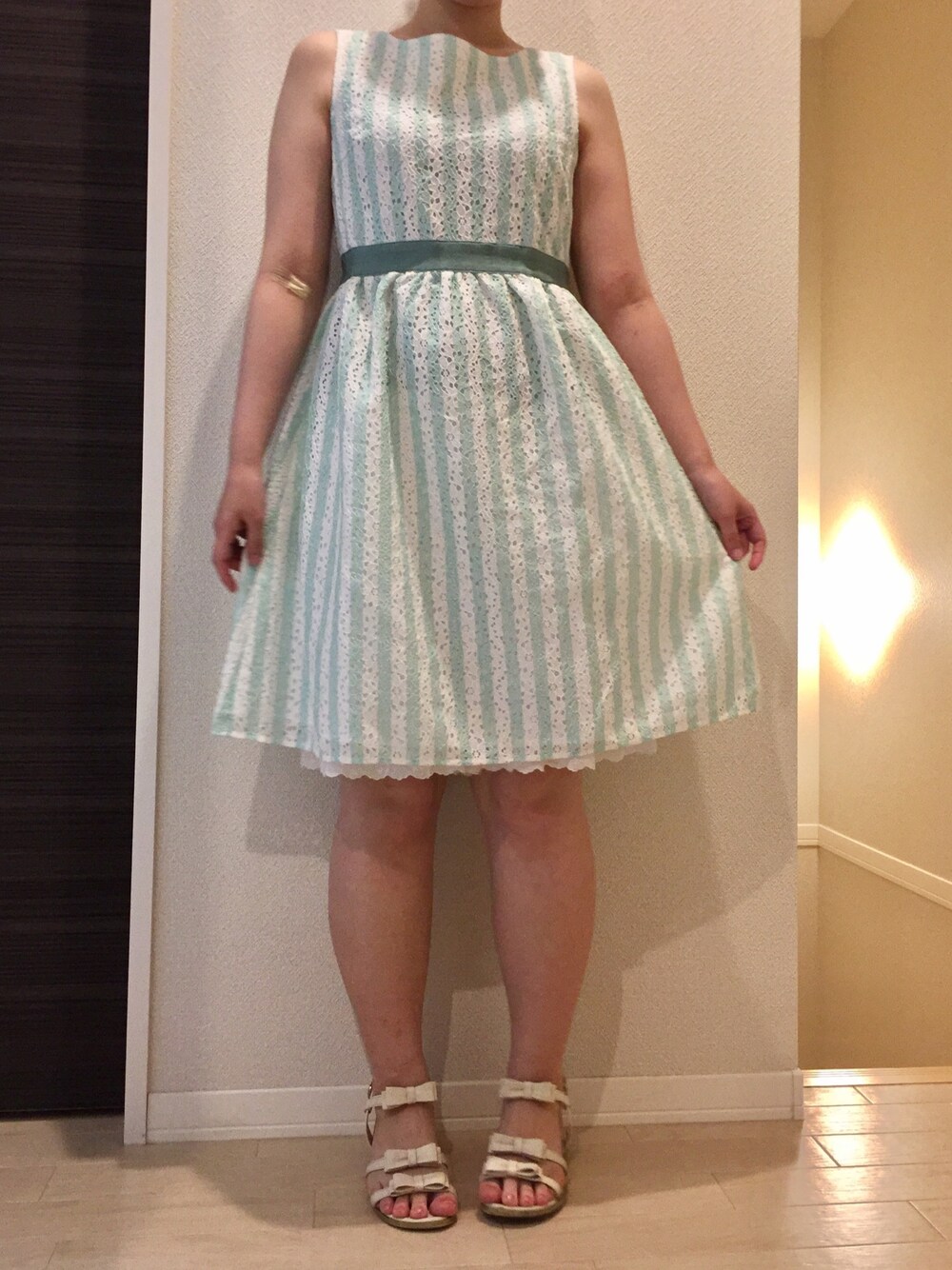 古着屋さんで見つけたワンピース♡ 白レース×ミントグリーンのストライプ×リボンがかわいくて即決でした! 丈も膝まであってうれしい(*^^*) もう少し暑くなったら、沢山着たいな〜〜