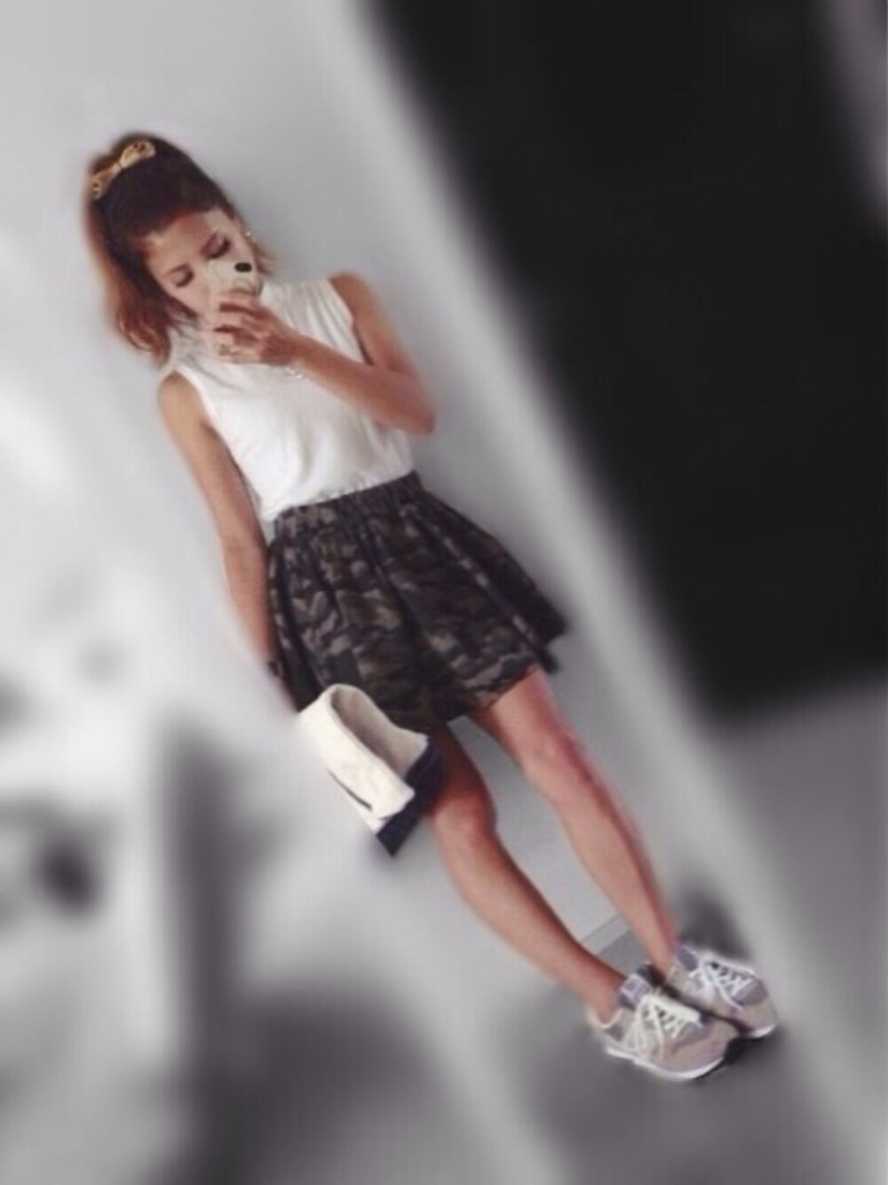カモフラSKを目立たせるために、他は全部シンプル! マスタードカラーのリボンのヘアゴムが少し秋意識♪