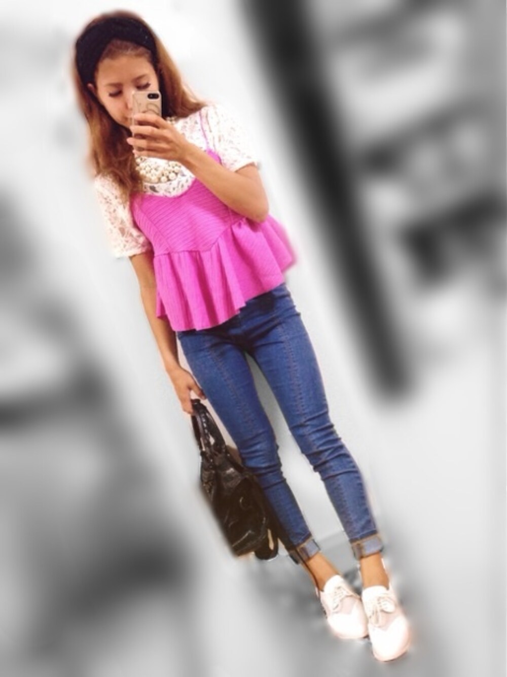 SALEで¥990で買ったペプラムキャミが主役のコーディネート♪ 形がすごく可愛いです♡ かなり明るいピンクで、誰ともかぶらなそうなのがお気に入りです☻♪ ペプラム以外はシンプルでまとめました☆
