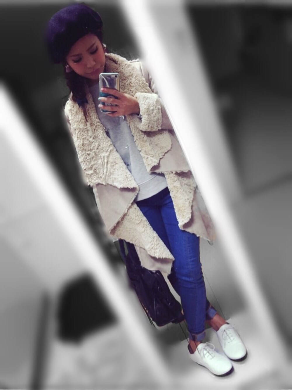 冬だけどライトな色のデニムが履きたい!と思って組んだコーディネート。 冬服は飽きました。。。 でも寒いのでフェイクムートンコート♡ 全体的に春っぽい色を意識しました! なので小物は黒をチョイス!