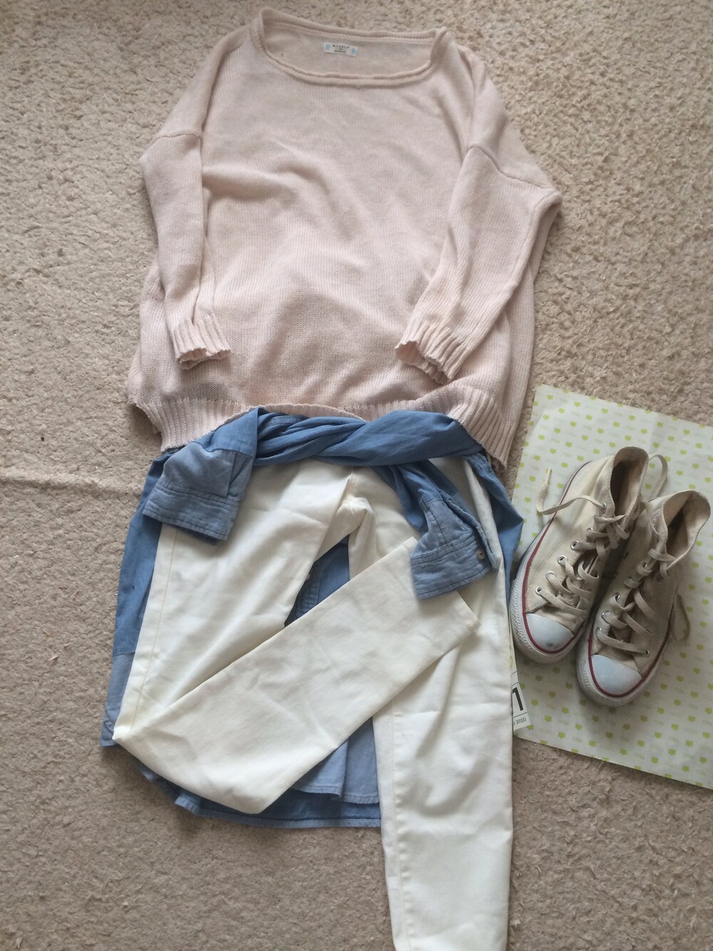 この白いパンツは大活躍だなー。 白でぼんやりするから、デニムシャツを腰巻き!