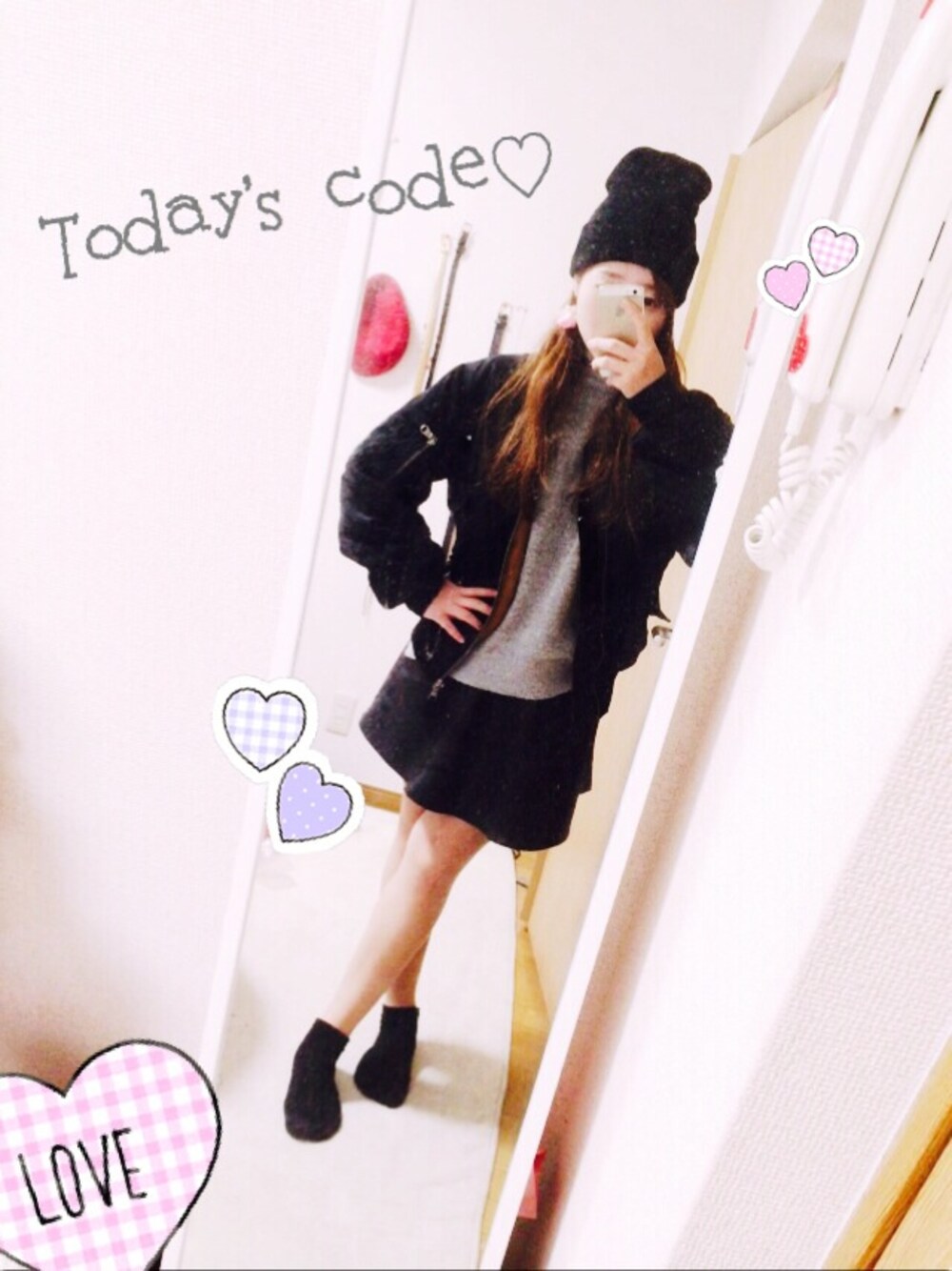 スタンプはもの隠しに。 黒でまとめて、アクセサリーに色を。 アクセサリーはハンドメイドの花びらピアス♡