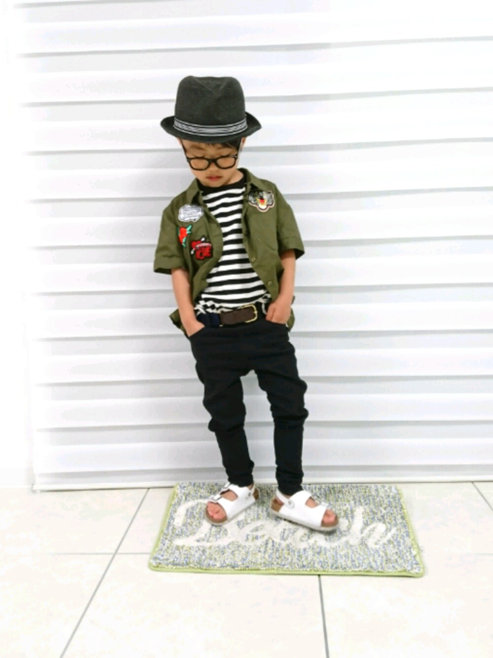 プチプラコーデ♪ 先日しまむらでカーキのシャツを購入しました(^^)チョット大きめ140㎝を購入してだぼっと着せてみました‼