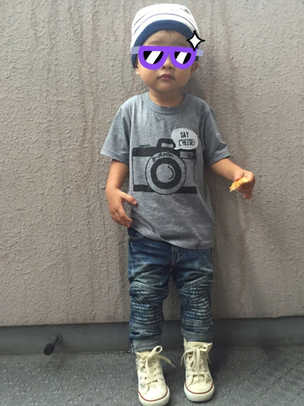 ゆるっとメンズ風コーデ。 実寸は身長90cmギリギリまだないくらいですが、110cmのカメラTシャツを着て、そのかわりスキニー系デニムを合わせてバランス良く。 膝のデザインがかわいいデニムはH&M。 今までサイズ70cmから100cmまでのベビーコーナーばかり見ていましたが、90cmから140cmまでのボーイズコーナーを見てみるとかっこいい系のアイテムがありました。 ボーイズやトドラーサイズになると色が暗かったりスモーキーな雰囲気ばかりで途端にかわいくなくなる事が多そうな男の子服ですが、このデニムは気に入りました(^^) サイズ100cmをかなりロールアップしてウエストアジャスターつきなのでゴムひっばってフィットさせて履かせています。 88cm 13.4kg 15.5cm←16cmのコンバースがもうすでにキツキツ、、、😞2歳になったところなのに、、オールスターハイカットはサイズ選びが難しい、、