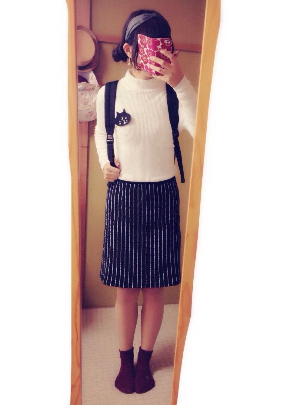 モノトーンコーデ 🎩 靴下は ボルドーにして 差し色に! パールイヤリングは 手作りです ♡♡ 白のタートルネックは 小中学生の頃に 買って着てたものを 掘りおこしました 笑