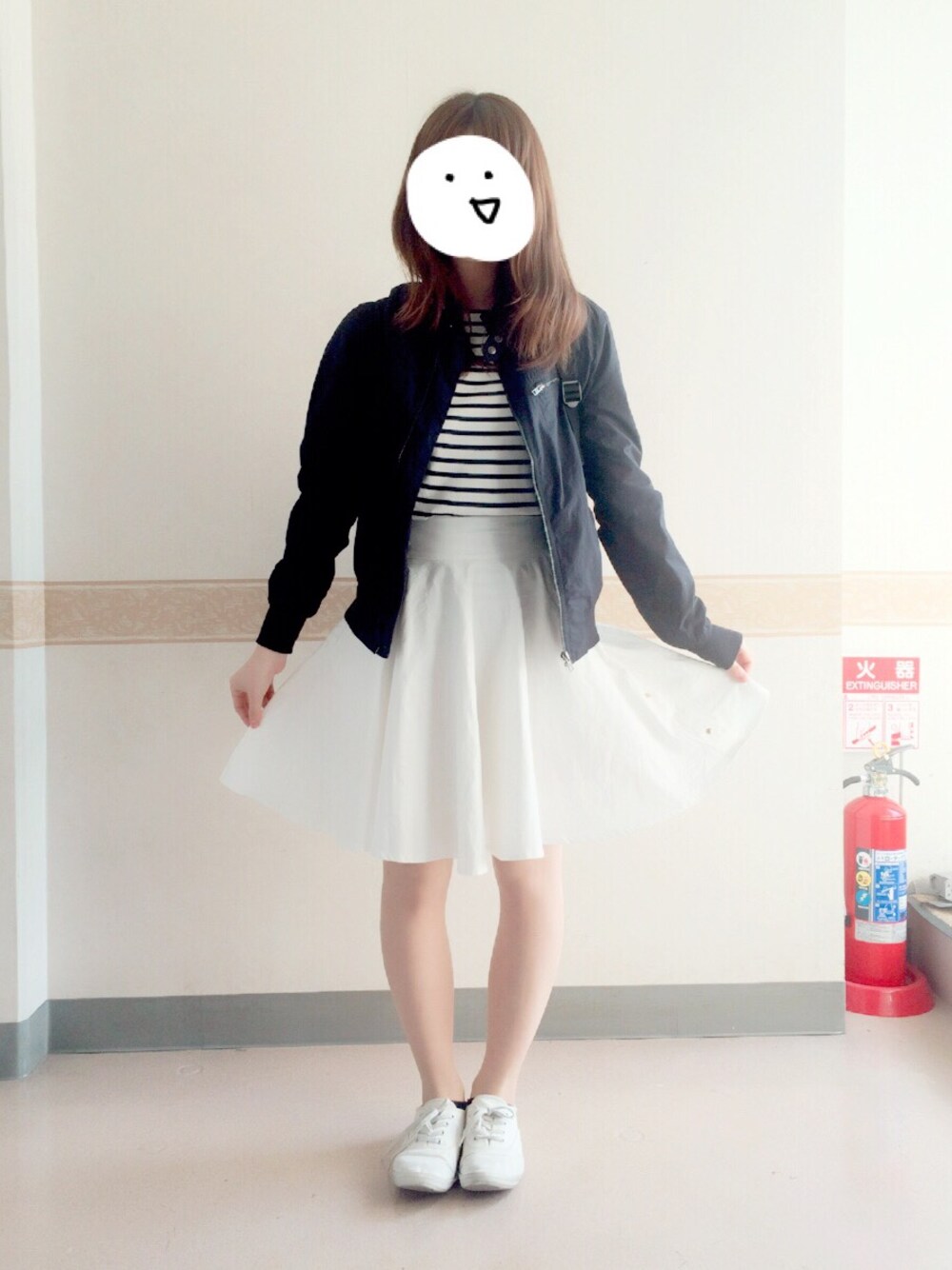 かってからしまいっぱなしだった ブルゾンと白のスカート解禁な日!! 黒にみえるけどネイビー×ホワイトです😇