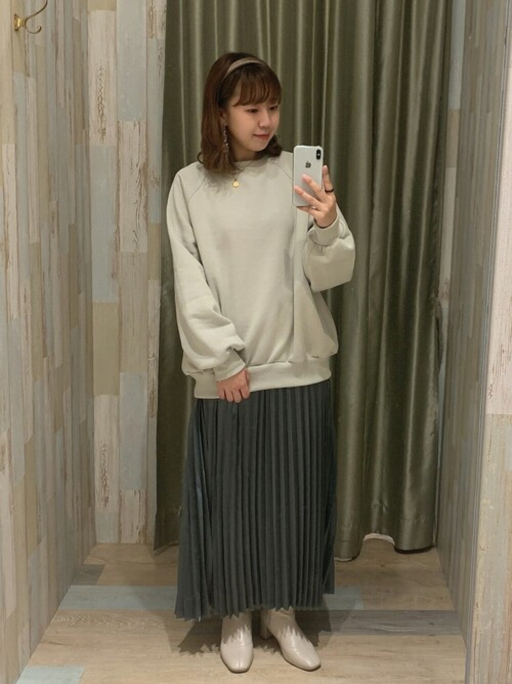 おはようございます☀ シンプルなトップスですが、光沢のあるプリーツスカートとブーツを合わせてカジュアルガーリーな雰囲気にしてみました!!