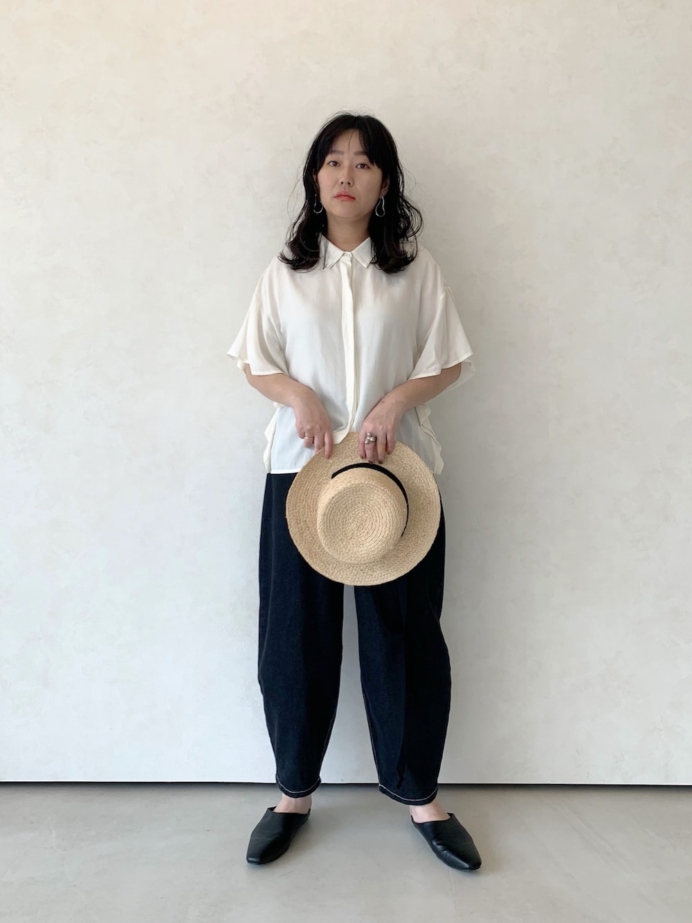 髪の毛ボサボサで、 きょとんとしておりますね、なぜか笑 おにゅーのフレアスリーブブラウス、 通称イカちゃんブラウス◎ 涼しいし形可愛くて色違いで欲しくなります、、。 安定のバルーンデニムパンツを合わせて◎