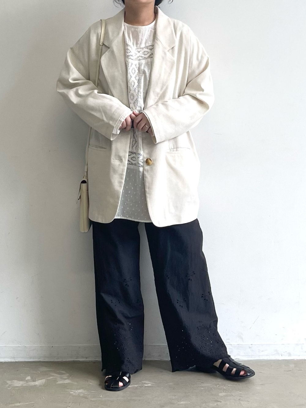 コットンブラウスにリネンのジャケットをプラス◎ 夏でも涼しく着られるのでお勧めですー!