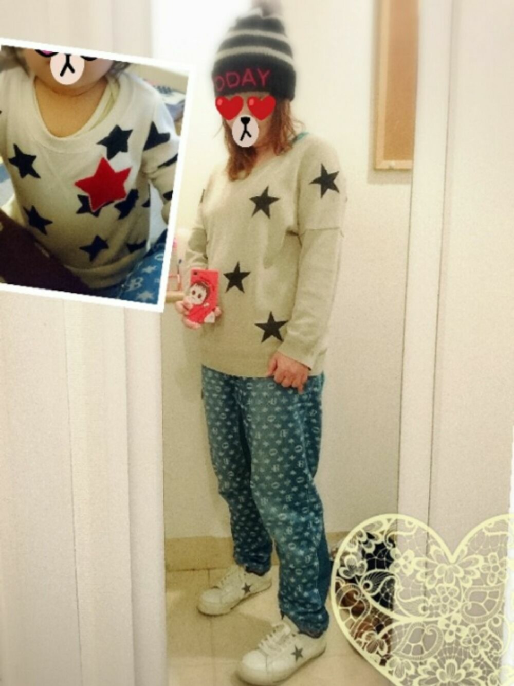 誰とも会う予定無いから徹底的に楽ちんコーデ… フラボアのコンバースコラボのデニムは数年前の福袋の中身で 今でも一年中履いております\(^o^)/楽ちん 合わせてスニーカーもコンバースで… 星柄ニットは10年近く前のイーハイのセール品ですが これも合わせやすくて今でも現役! そして今日の我が娘(左上)も偶然星柄だった!(西●屋のワンピを少しリメイクしたもの) 昨日の上下の色は意識して合わせたけど 今日は何も考えずこの星柄を選んでた(^ρ^) SWIMMER終了寂しい_| ̄|○地味に好きだったのに
