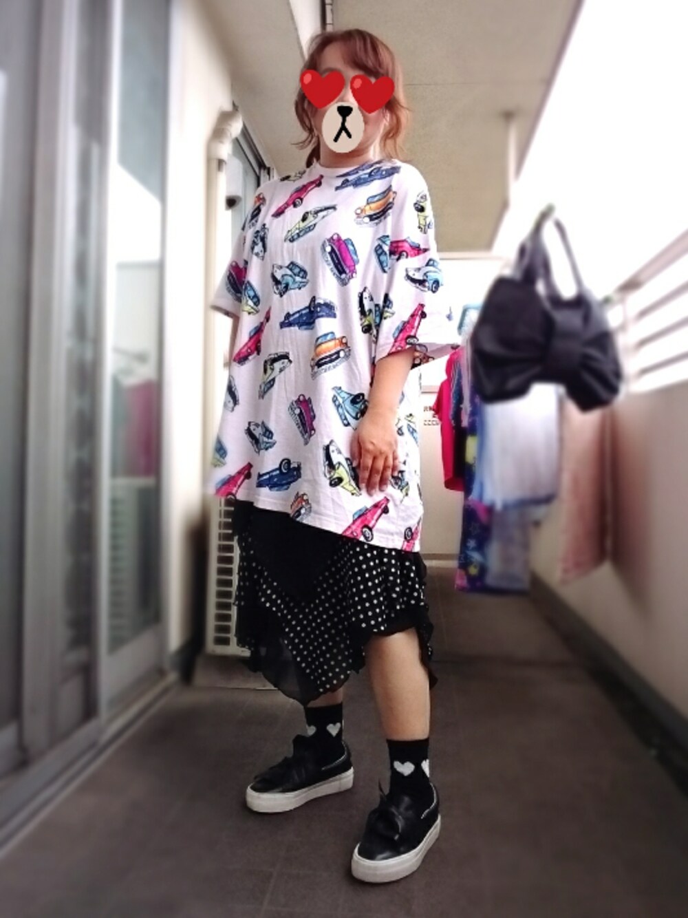 着て鏡を見た感じはいいかも!と思ったけど 写真撮って見ると…あれ?なんか違う… ってなったコーデ/(^o^)\ 車柄Tをワンピっぽく着たい!と思い でも1枚じゃ辛いのでこうなりました。 靴は薄紫ジョージコックスと悩んだ結果 下半身は黒1色のほうが車柄が引き立って見えたので… まぁ今日は冒険コーデってことで|彡サッ