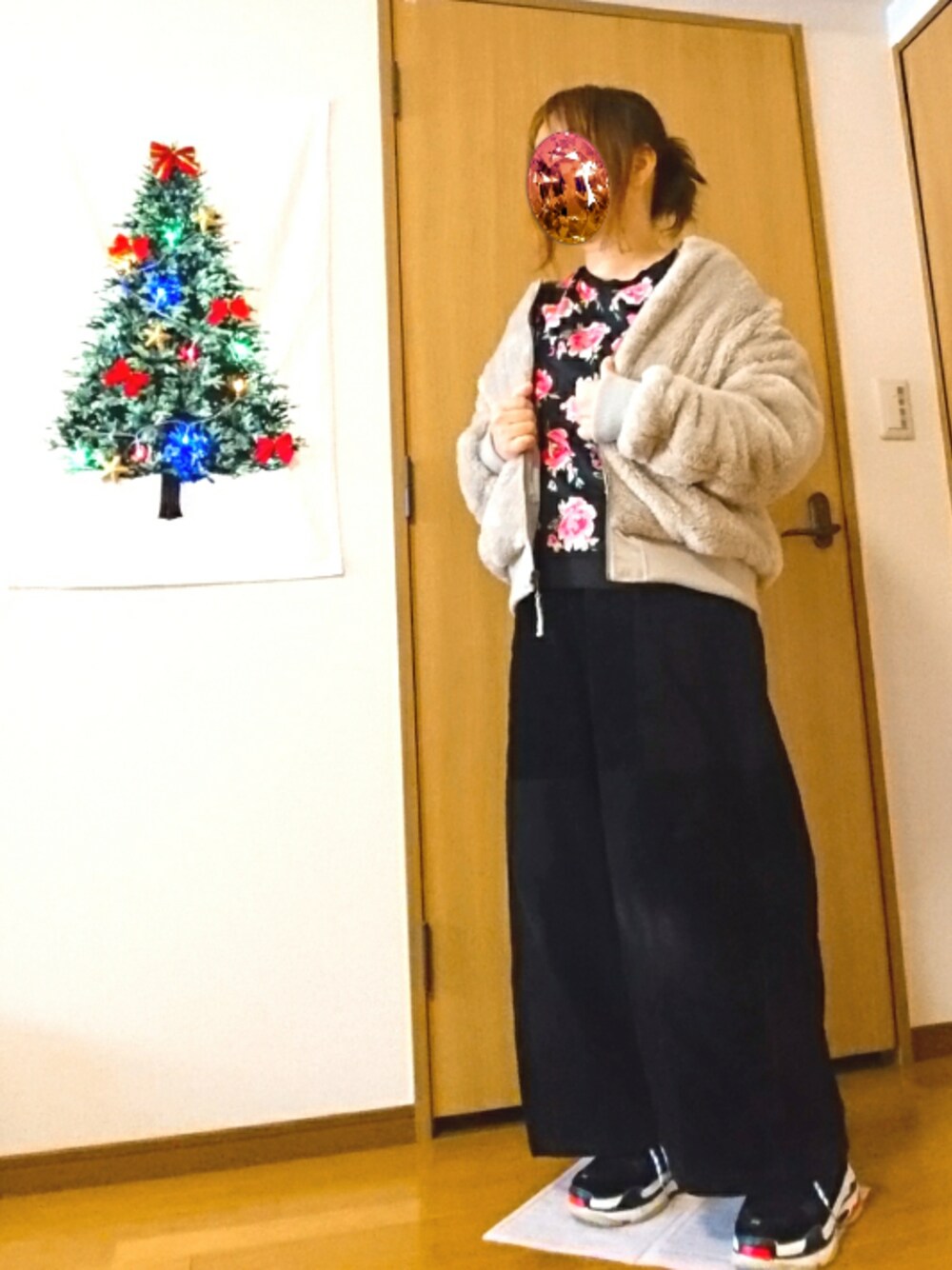 ん?抜き襟?襟抜き?こうでいいの? なんか落ち着かねーな……な、コーデ(何 写真の時だけ抜き襟だか襟抜きだかを やってみましたが 普段は普通に着ています|彡サッ CUBE SUGARリバーシブルMA-1を ボアブルゾン側にして着てみました(^ρ^) あ、左のツリーにLEDライトがつきました(^ρ^)笑