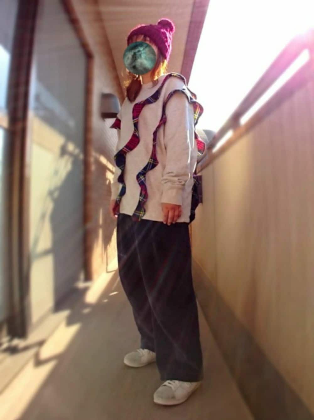 今日は実家に行ったので楽ちんコーデ ひさしぶりにバルコニーで撮ったら 右上から光が(笑 ニット帽はセールで300円でした(^ρ^)
