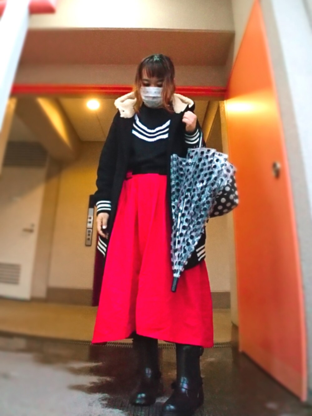 赤いスカートを買いました…コーデ 近くのお店で閉店セールをやってて1900円ぐらい! せっかくベルト付きなのでトップスイン(^ρ^)