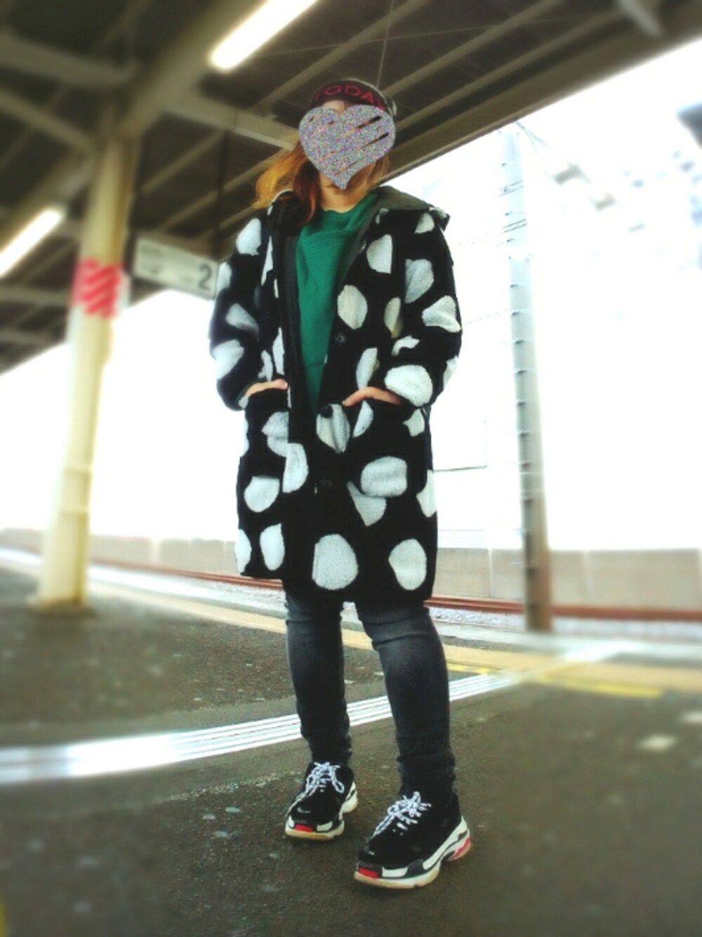 冬に逆戻りコーデ 今日はなんでこんなに寒いのか(((^-^))) 冬アウターはもうほとんど クリーニングに出してしまったけど このドットのは家で洗うつもりで 残しておいたので(^ρ^) 星スウェットもあまり着てなかったので 寒いうちに着ておこうと慌てて着ました(笑