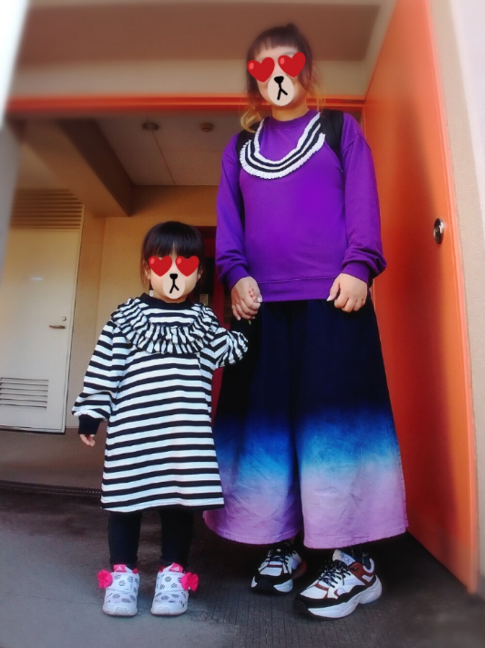 午前中は娘と音楽教室行って 午後はまったりそのへんをお散歩…コーデ あまり共通点のない親子ーデだと思ってたら 偶然にもふたりとも胸元フリル服だったという… 娘のワンピースはバースデイで購入(^ρ^)