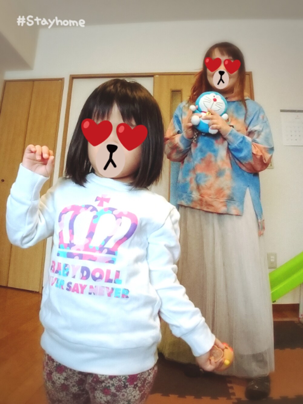 ひきこもりデーだけど タイムセールとクーポンでお安く買った 新しいパーカーをおろしましたコーデ ソックスの色はパーカーの紐と合わせました(^ν^) 母はドラえもん 娘はアンパンマンを手に(笑) このベビドのスウェットにはいつも 花柄パンツ(しまむら)を合わせてしまうな|彡サッ