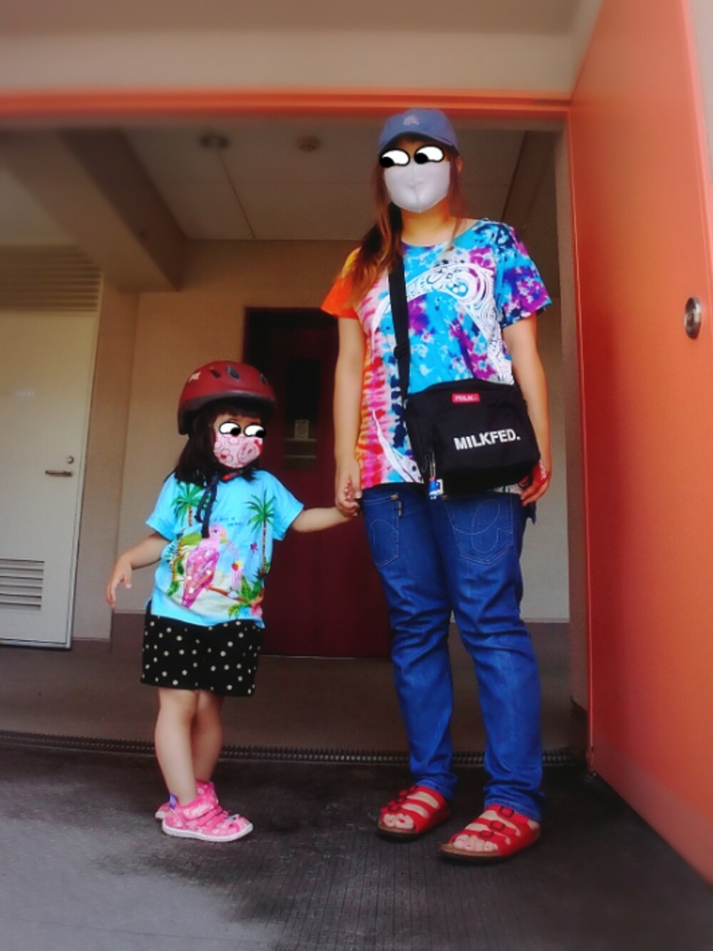 夏全開な派手Tシャツを着て 自転車でお昼ごはんを買いに行っただけおやこーデ 母のタイダイTはお店で見て気になって半額で買ったもの なんか海に行きたくなるTシャツです(何 娘のTシャツはセールでお安くGET 娘キュロットパンツは実物は110サイズです (またGUアイテムは1サイズしか登録できない謎現象) 娘サンダルは去年夏も大活躍だった BREEZE×IFMEの今年のものですが 幼稚園は靴下+スニーカーで行くから 去年ほどはたくさん履けなさそうかな… 娘マスクは母の手作りドラミちゃん(^ν^)