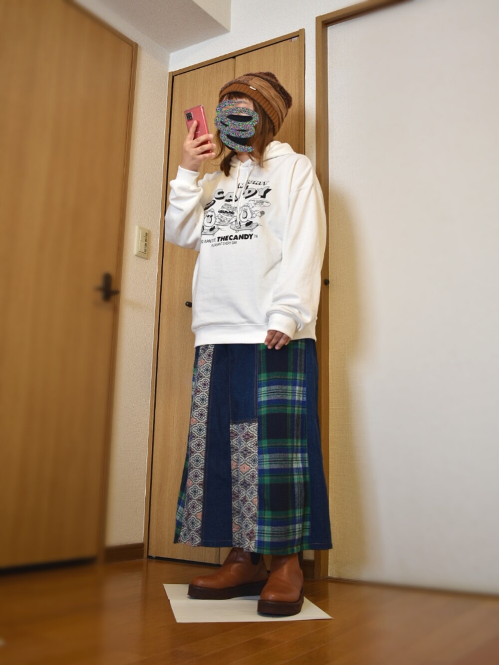 ぴよりあのニットキャップ/ビーニー「パッチワークターバンキャップ」を使ったコーディネート