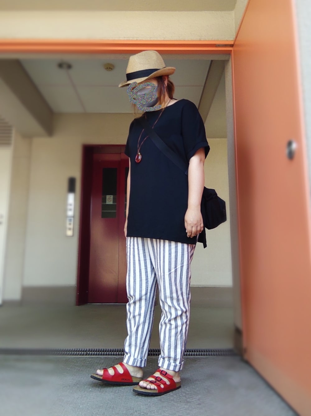 7月1日金曜日のコーデ カラーパンツに合わせたくて 無印で買ったシンプルトップス 今日はストライプパンツ合わせ! ネックレスとサンダルは赤で揃えました(^ν^) 以上|彡サッ