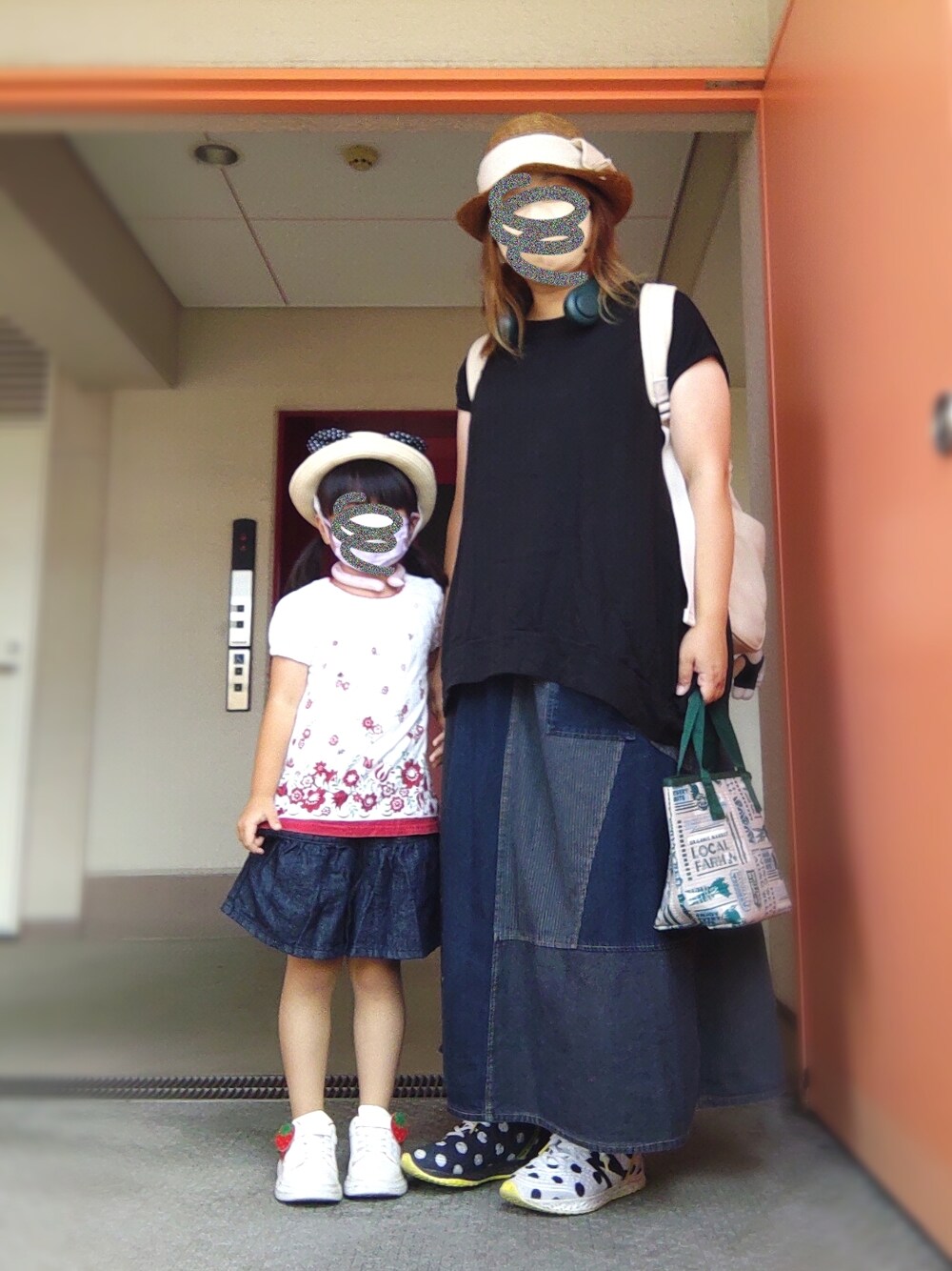 実家に行ってきたコーデ 今日のタグがデニムスカートだったので 母はデニムスカート 娘はデニムキュロットスカート(GU) 母は首に扇風機 娘は首にアイスリング(^ν^) 母が手に持ってるのはオーサムストアで買った保冷バッグ 実家でもらったものを持ち帰るために持参(笑) 以上|彡サッ
