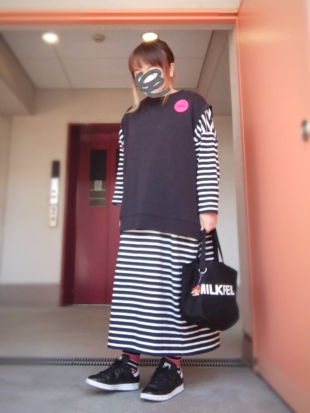 3月10日のコーデ モノトーンに差し色ピンク\(^o^)/ ワンピも靴下もボーダー🦓 以上|彡サッ
