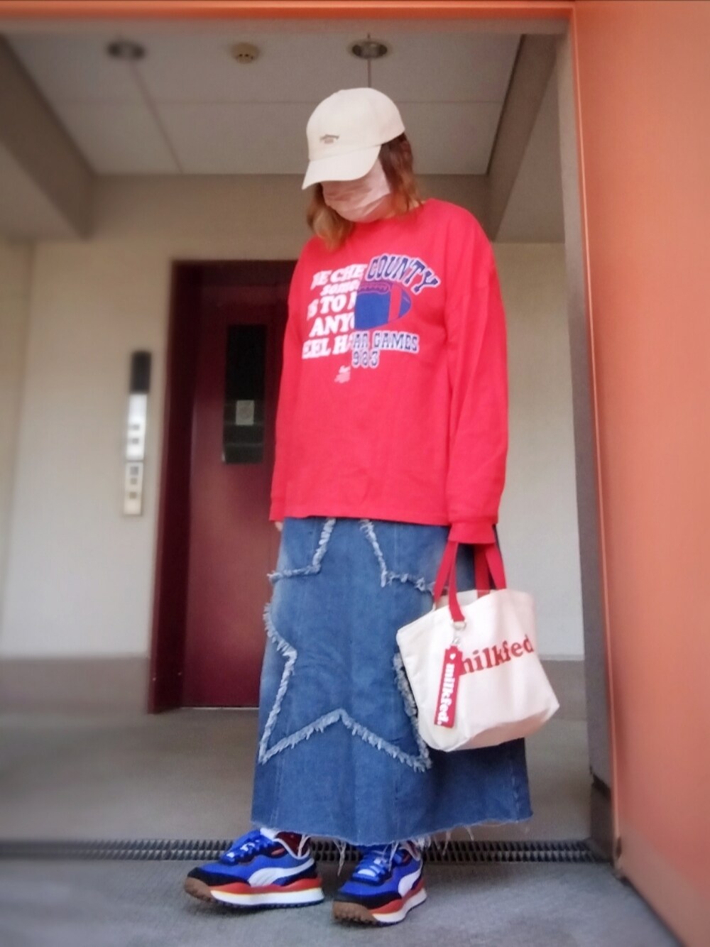 5月12日のコーデ 赤と青と白(アイボリー) 今日のタグは淡色コーデでしたが その真逆を行っていますね← 靴下は2〜3年前にH&Mで買ったやーつ 靴下収納に入らない買い置き靴下が多すぎて だいぶ後回しになっていたやつです💦 赤のドットのを履いています(^ν^) 以上|彡サッ
