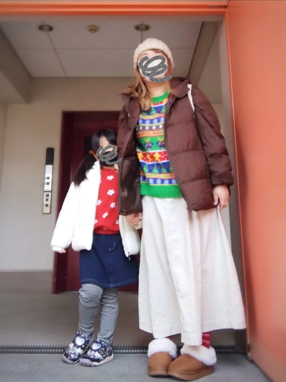クリスマスイブのおやこーデ 母は今日を逃したら1年着れない クリスマスセーター 先週セールで買った コーデュロイスカートを合わせました(^ν^) 娘もほんのりクリスマスカラー🎄 娘アウターはX-girl Stages福袋の中身 スカートパンツは西松屋 以上|彡サッ