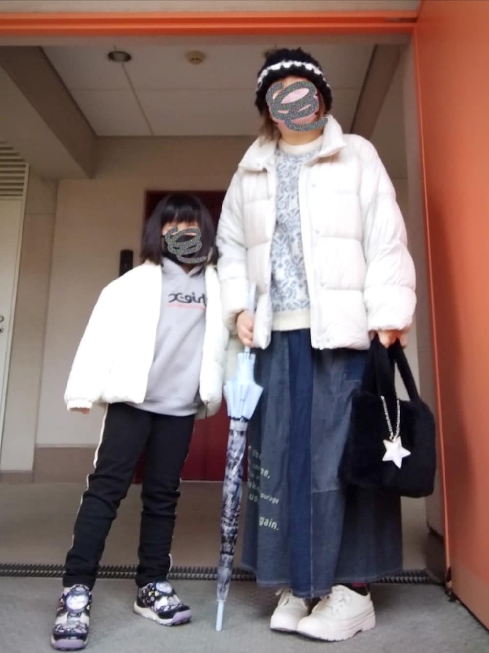 今週も娘の耳鼻咽喉科へ…2月5日のおやこーデ 雪予報のためあたたかくしました (母はスカートの下にホカロンレギンス着用) 娘はアウターとパーカーが エックスガールステージス(福袋) 以上|彡サッ