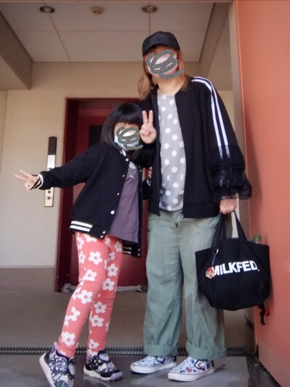 そしてこちらは今日4月2日のおやこーデ 今日はプチプラではないものの 昔のアイテムばかり💧 いいものは長く着るのです(という言い訳 以上|彡サッ